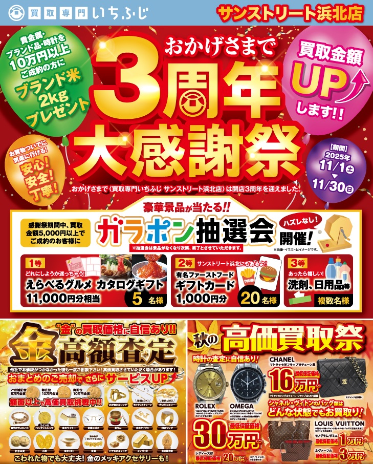 いちふじ サンストリート浜北店にて3周年”大感謝祭”を開催!【11/1(土)〜11/30(日)】金 貴金属 ブランド 時計を高価買取!