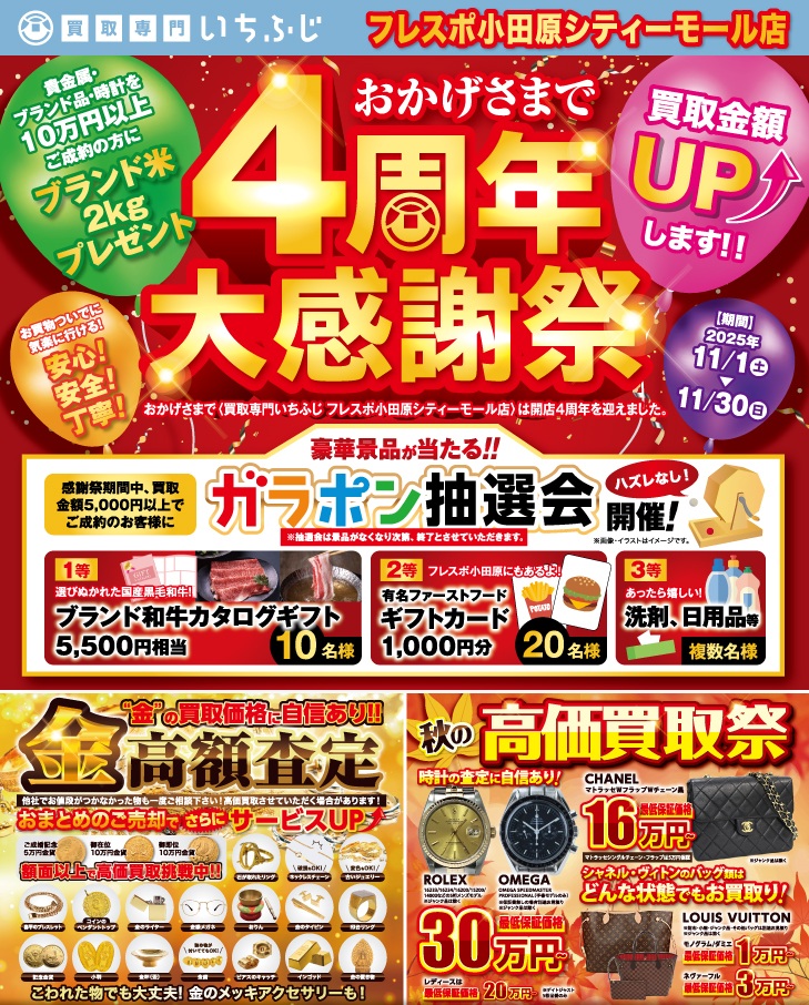 いちふじ フレスポ小田原シティーモール店にて4周年”大感謝祭”を開催!【11/1(土)〜11/30(日)】金 貴金属 ブランド 時計を高価買取!