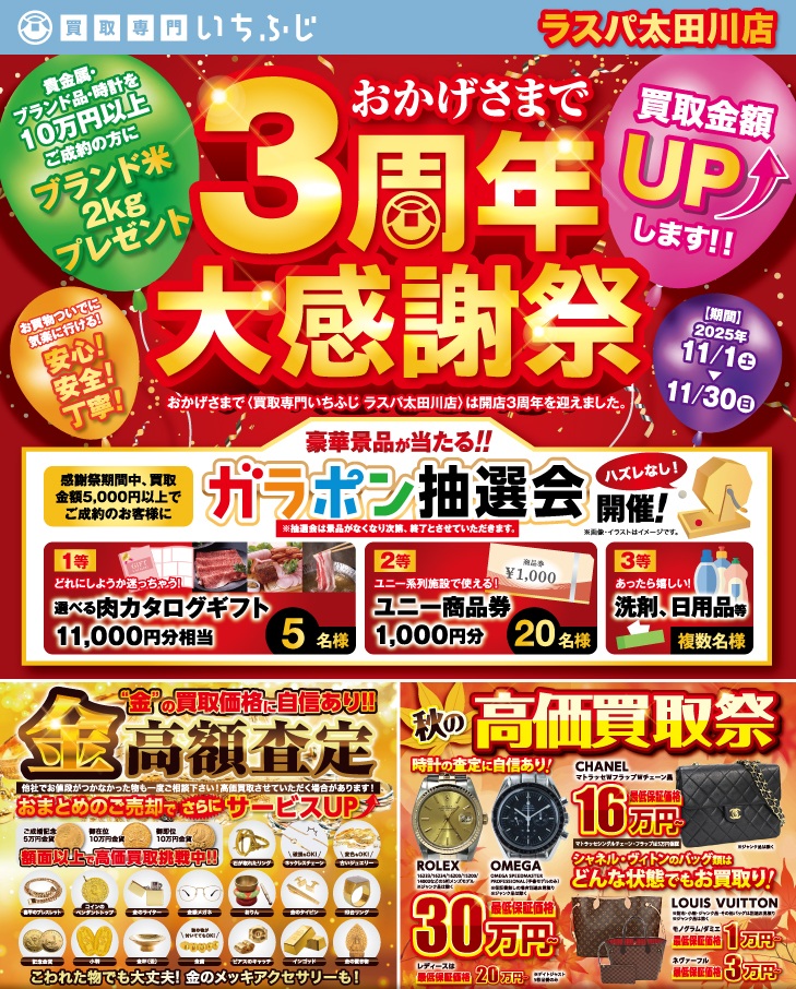 いちふじ ラスパ太田川店にて3周年”大感謝祭”を開催!【11/1(土)〜11/30(日)】金 貴金属 ブランド 時計を高価買取!