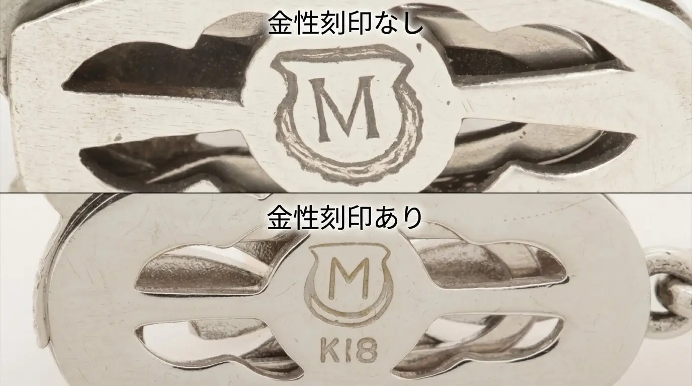 ロゴ刻印と並んでアイコニックなのが、アコヤ貝(二枚貝)のシルエットの中に「M」の文字を配置したメーカーズマークです。これはミキモトが厳しい品質検査をクリアした正規品であることを保証する伝統的な証であり、この刻印が確認できることで査定時の評価は確固たるものになります。