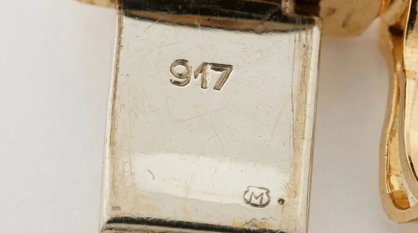 一般的なK18(18金)は「750」と刻印されますが、ごく稀に「917」と打たれたミキモトジュエリーが存在します。これは「K22(22金)」を意味する1000分率の表記(純度91.7%)です。純金に近い非常に柔らかく美しい黄金色を放ち、地金としての価値もK18を大きく上回るため、高額査定の対象となります。
