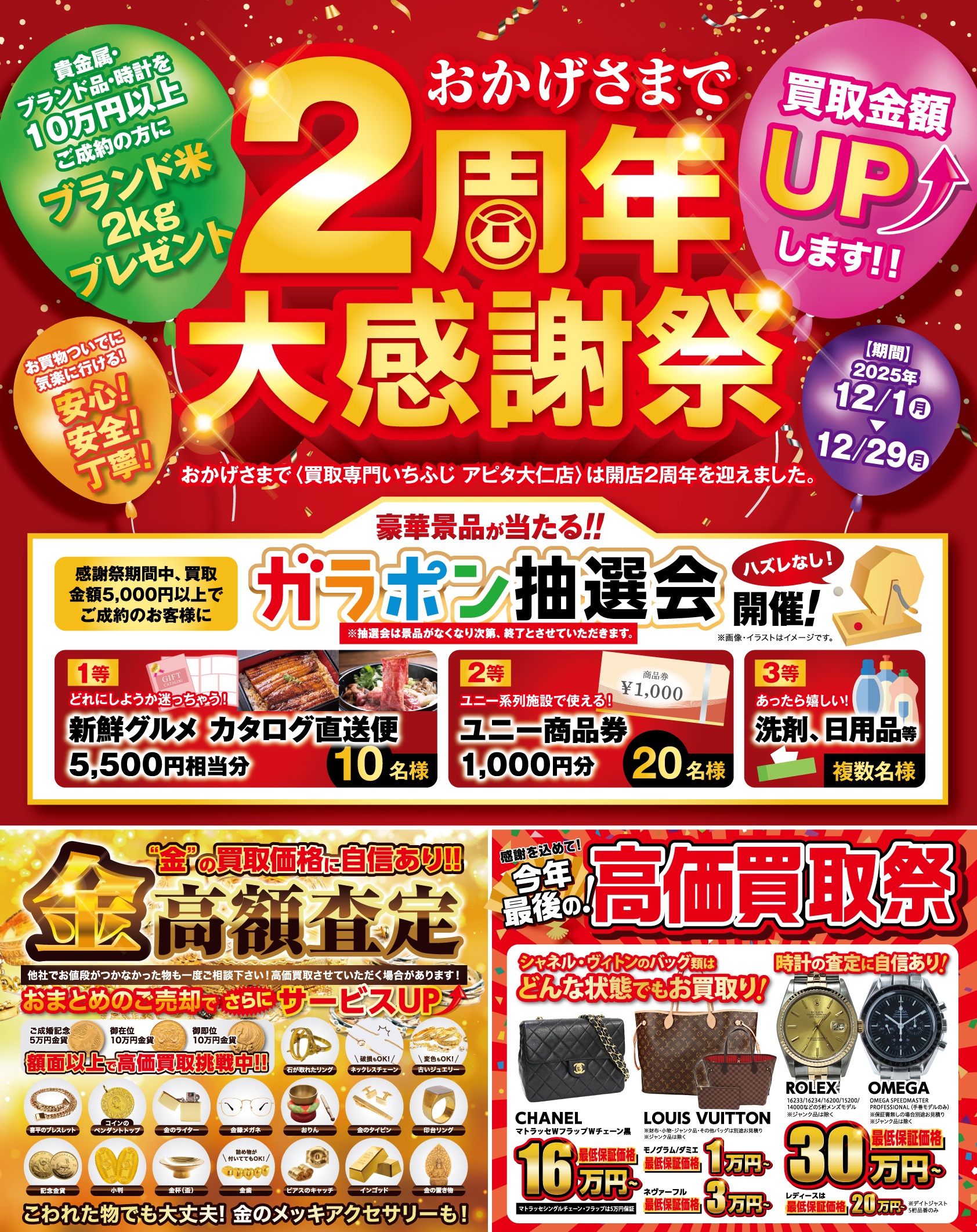 いちふじ アピタ大仁店にて2周年”大感謝祭”を開催!【12/1(月)〜12/29(月)】金 貴金属 ブランド 時計を高価買取!