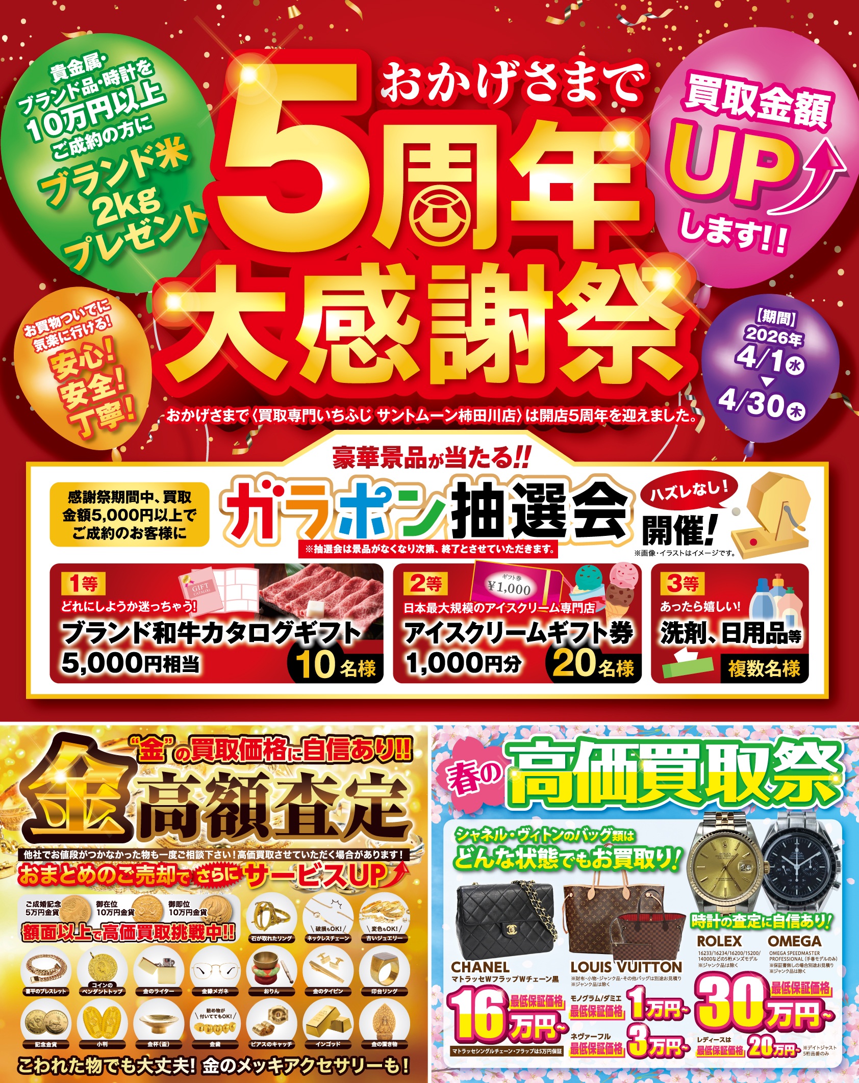 サントムーン柿田川店にて5周年”大感謝祭”を開催!【4/1(水)〜4/30(木)】金 貴金属 ブランド 時計を高価買取!