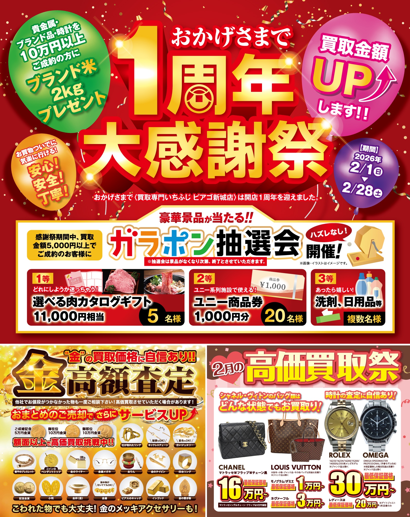ピアゴ新城店にて1周年”大感謝祭”を開催!【2/1(日)〜2/28(土)】金 貴金属 ブランド 時計を高価買取!