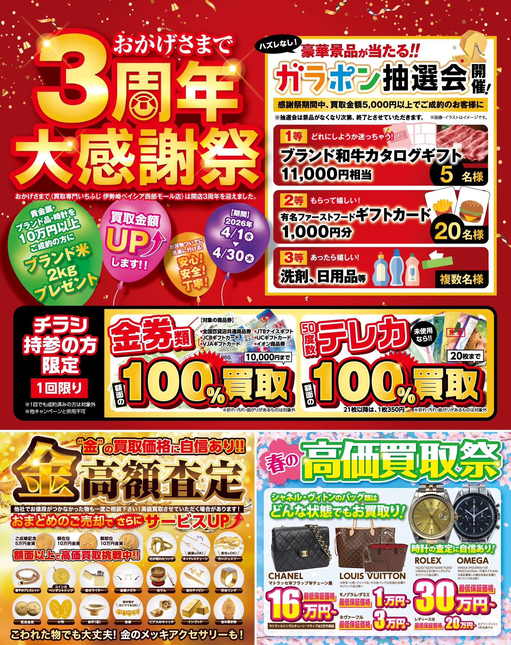 伊勢崎ベイシア西武モール店にて3周年”大感謝祭”を開催!【4/1(水)〜4/30(木)】金 貴金属 ブランド 時計を高価買取!