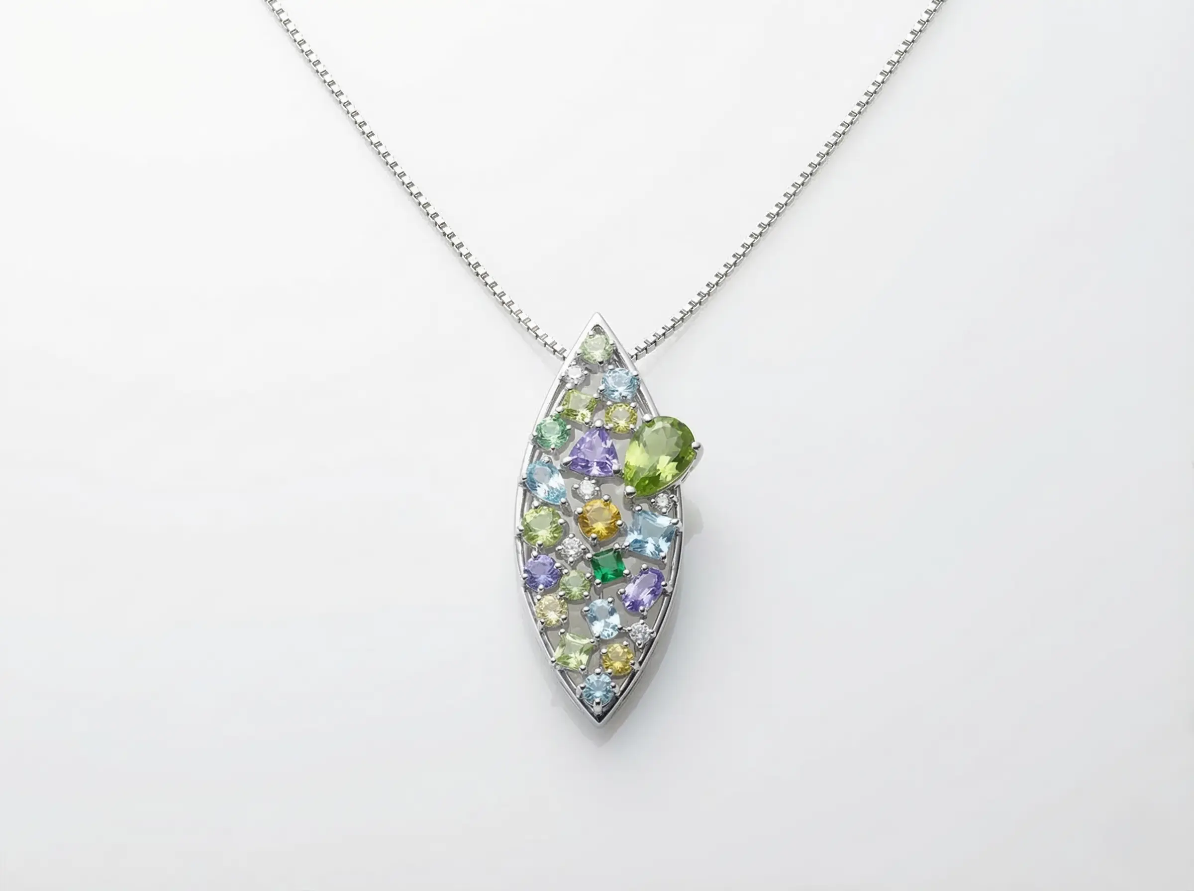 アメジスト、ペリドット、サファイアなど、多種多様な天然石を配置。植物の有機的な美しさを、絶妙な色調のグラデーションで表現しています。18金ホワイトゴールド(K18WG)の清涼感ある輝きが、色石の美しさを最大限に引き立てています。
