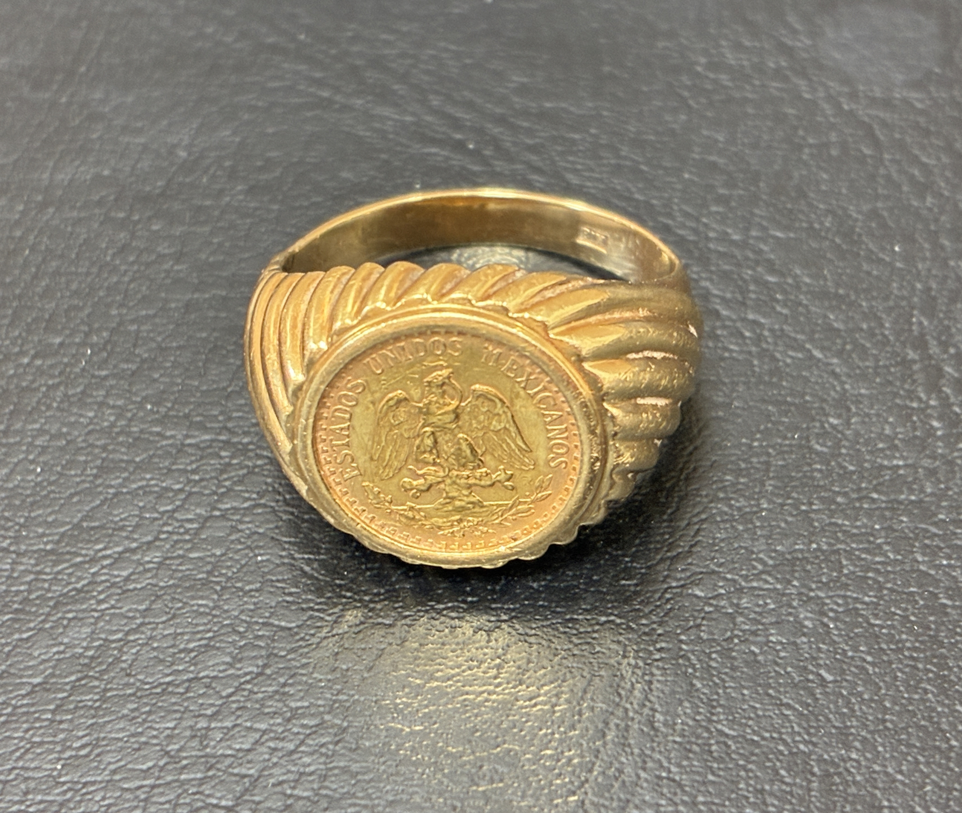 18金リングに21.6金金貨(メキシコ2ペソ)がついています。