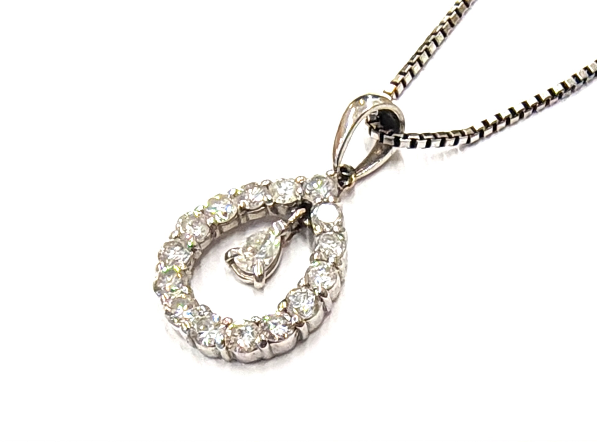 今回お持ち込み頂いたお品は、Pt850のネックレスにのPt900ダイヤ付きペンダントトップが付いたお品です。合わせて1.11ctのダイヤモンドが付いた素敵なネックレスです。