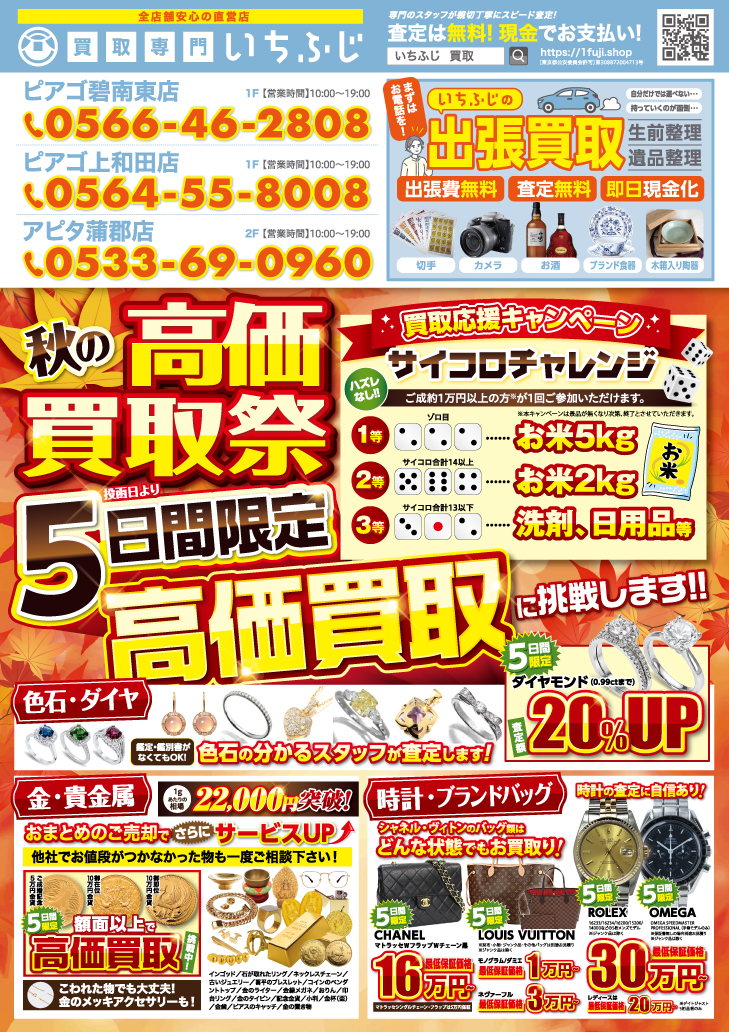 期間中は、貴金属・ブランド品・時計・金券などを対象に“秋の特別査定”を実施。