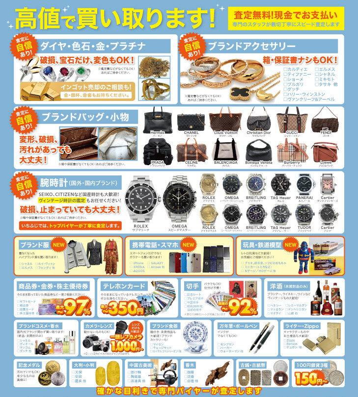 金・プラチナ・貴金属 / ダイヤモンド・宝石・色石 / ブランドジュエリー / ブランドバッグ・小物 / ブランド腕時計 / 金歯・金杯・銀杯 / メッキアクセサリー・真珠・パール / 日本切手・中国切手 / はがき / 収入印紙 / 商品券 / 金券 / 株主優待券 / 図書カード / ビール券 / 旅行券 / テレホンカード / オレンジカード / クオカード / ライター / サングラス / ブランド文具・食器・ブランドコスメ・香水 / カメラ / 古銭・古紙幣・外国コイン / 金貨・銀貨 / 記念硬貨 / 骨董品 / 絵画・掛け軸 / 香木 / ブランデー・ウイスキー・シャンパン / スマートフォン / ブランド服 / 玩具 etc