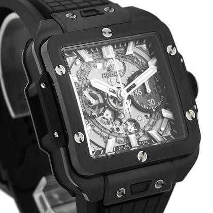 このモデルは、ウブロ初のスクエア型ケースを採用した「スクエア・バン」シリーズの中でも、ブラックセラミックを使用したスタイリッシュな一本。ウニコムーブメントを搭載し、スケルトン仕様の文字盤からは精密な機構が覗きます。重厚感と未来感が融合したデザインは、まさにウブロの哲学そのもの。