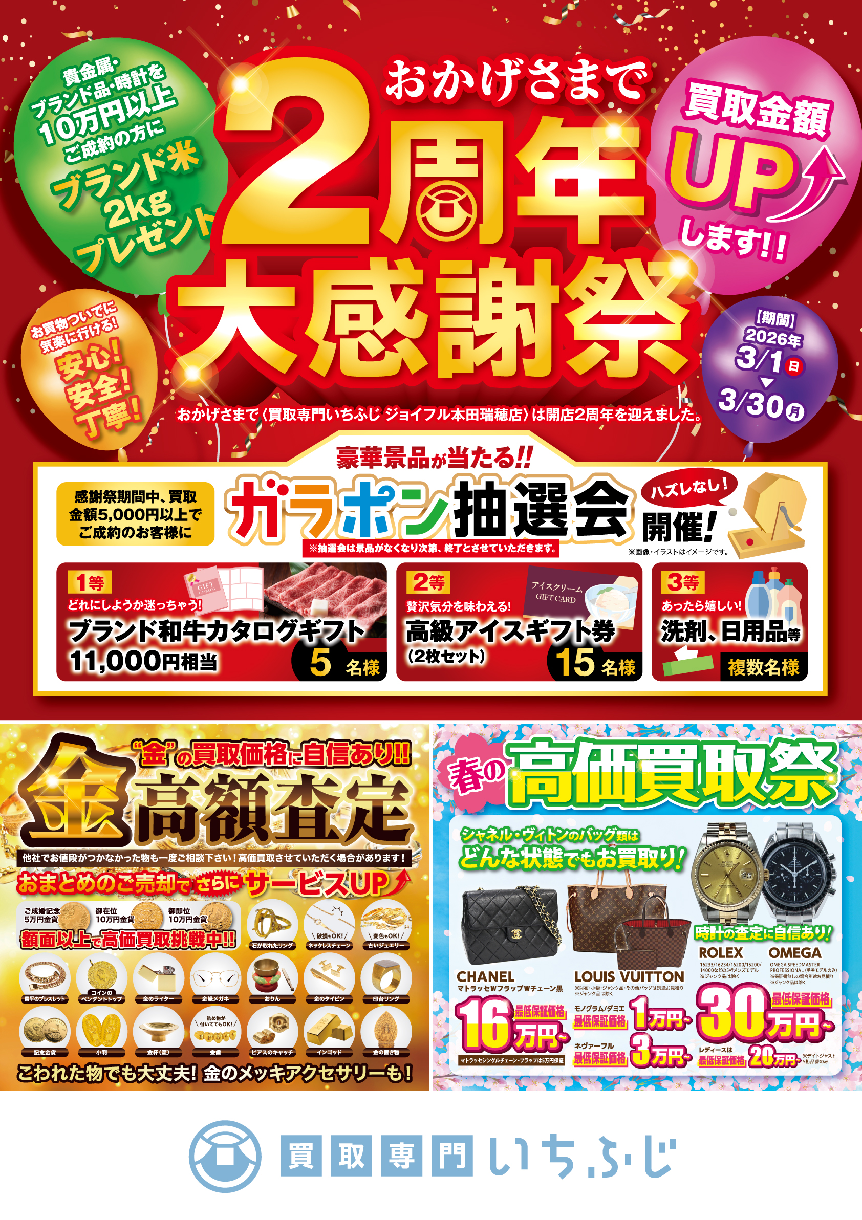 いちふじジョイフル本田瑞穂店は おかげさまで2周年迎えました!只今 大感謝祭実施中!【瑞穂町・武蔵村山市・東大和市・青梅市・所沢市・入間市の お買取りならいちふじジョイフル本田瑞穂店へ】