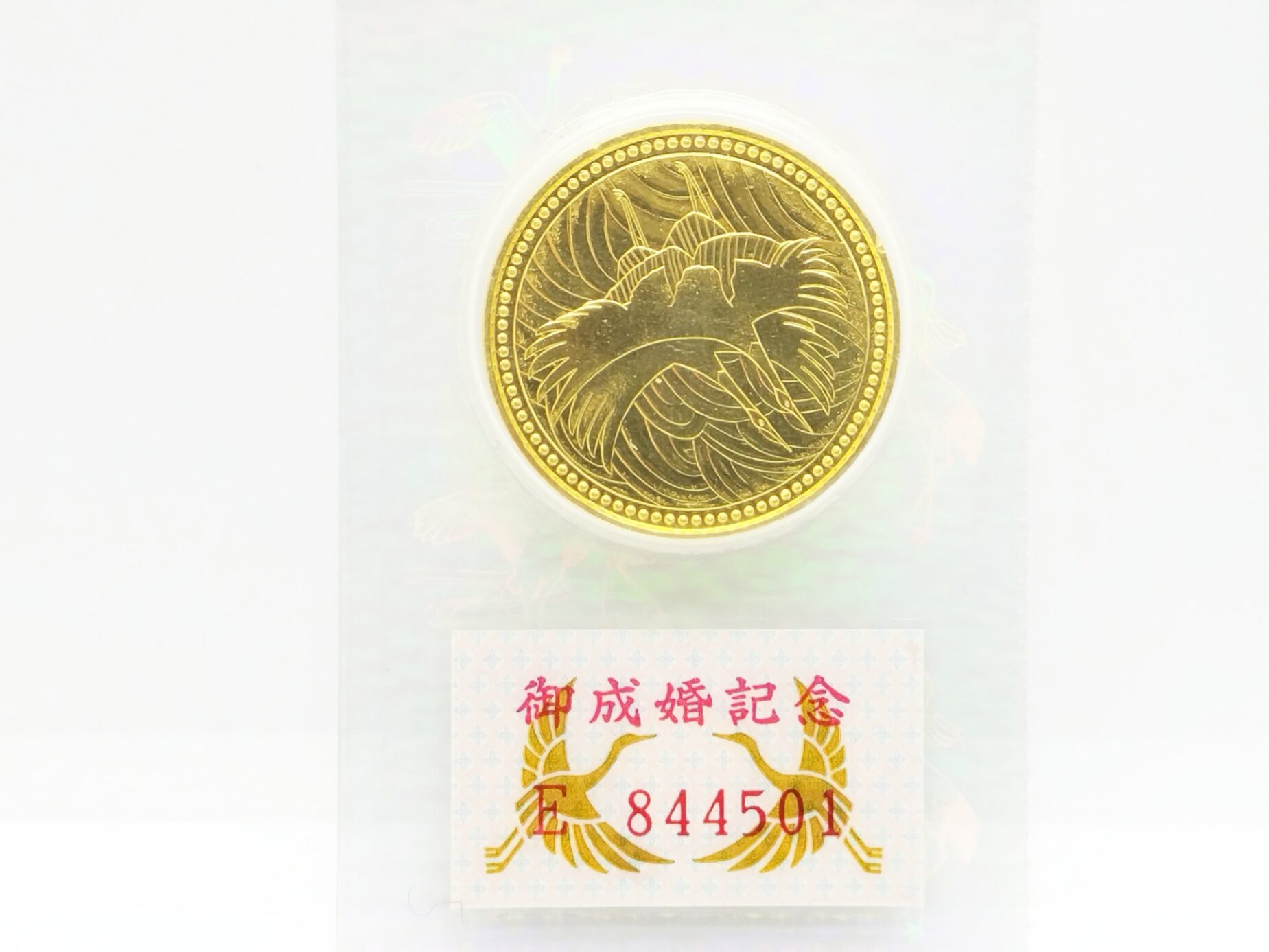 今の天皇皇后両陛下のご成婚を祝して発行された金貨です。