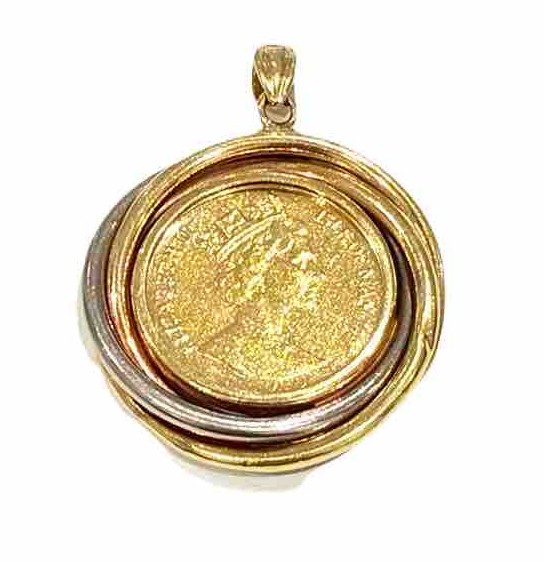 写真の18Kコインモチーフペンダントトップは、金の品位が18金(K18)の素材で作られ、コインの意匠をモチーフにした装身具です。実際の法定通貨そのものではなく、装飾目的で製作されたジュエリーに分類されます。