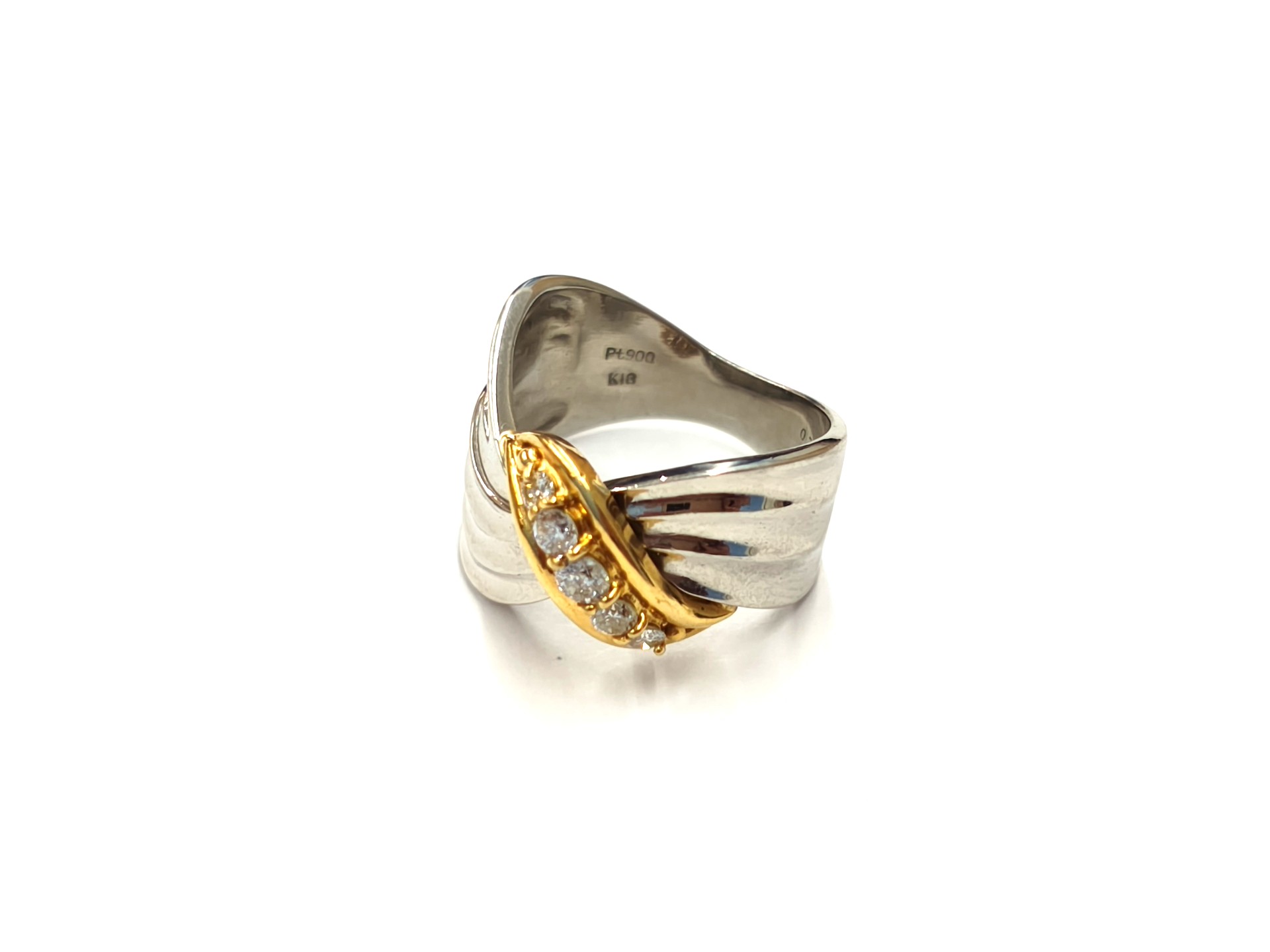 プラチナ900/K18コンビのリングです。存在感のある素敵なお品ですがお使いにならないそうです。コンビリングとは、異なる素材(主にプラチナとゴールド)を組み合わせて作られた指輪のことです。これにより、色の対比が生まれ、デザイン性が増し、個性的な印象を与えることができます。