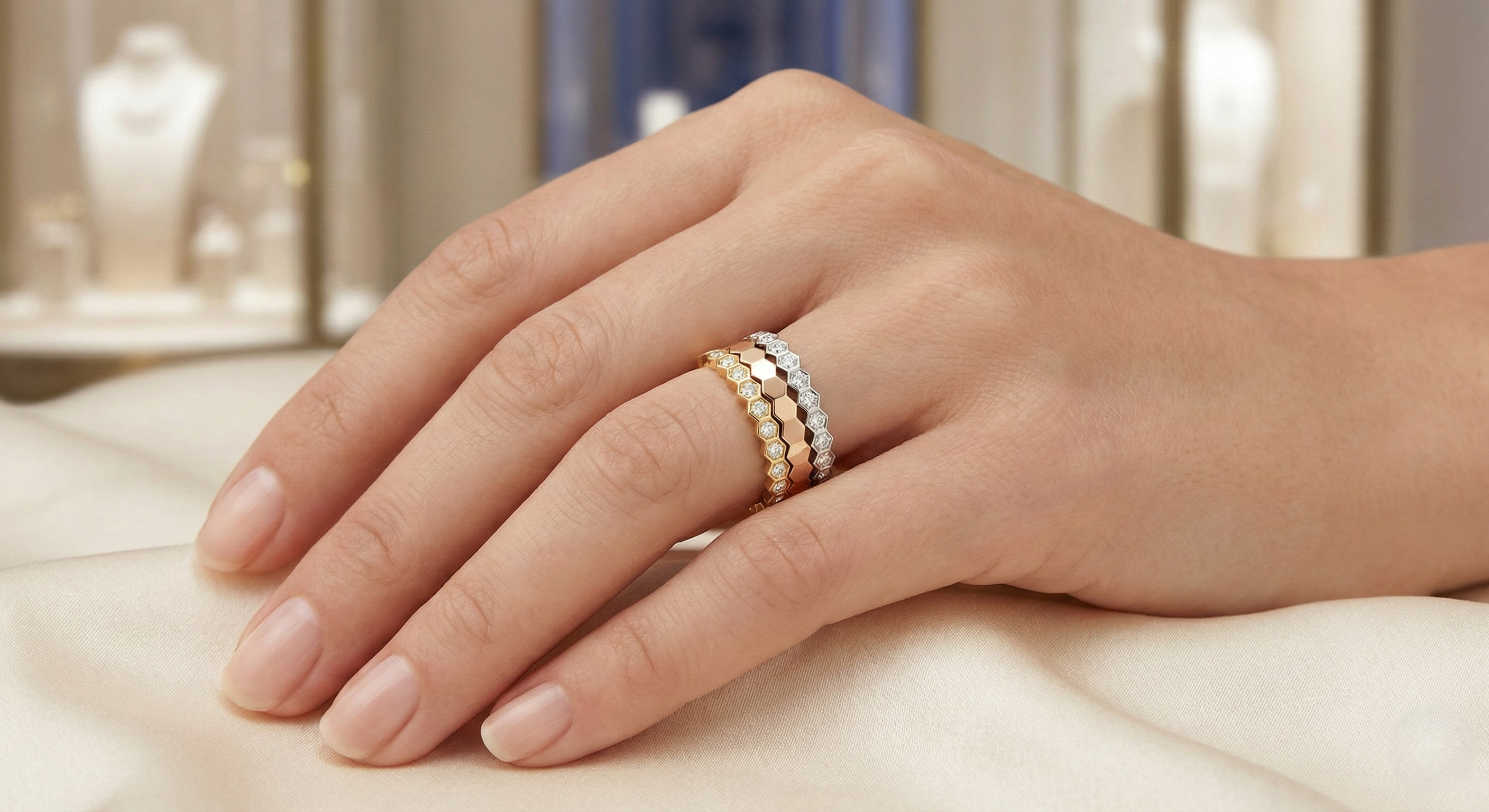 現在のショーメ人気を牽引しているのが、ミツバチの巣(ハニカム)をモチーフにした「ビーマイラブ」です。