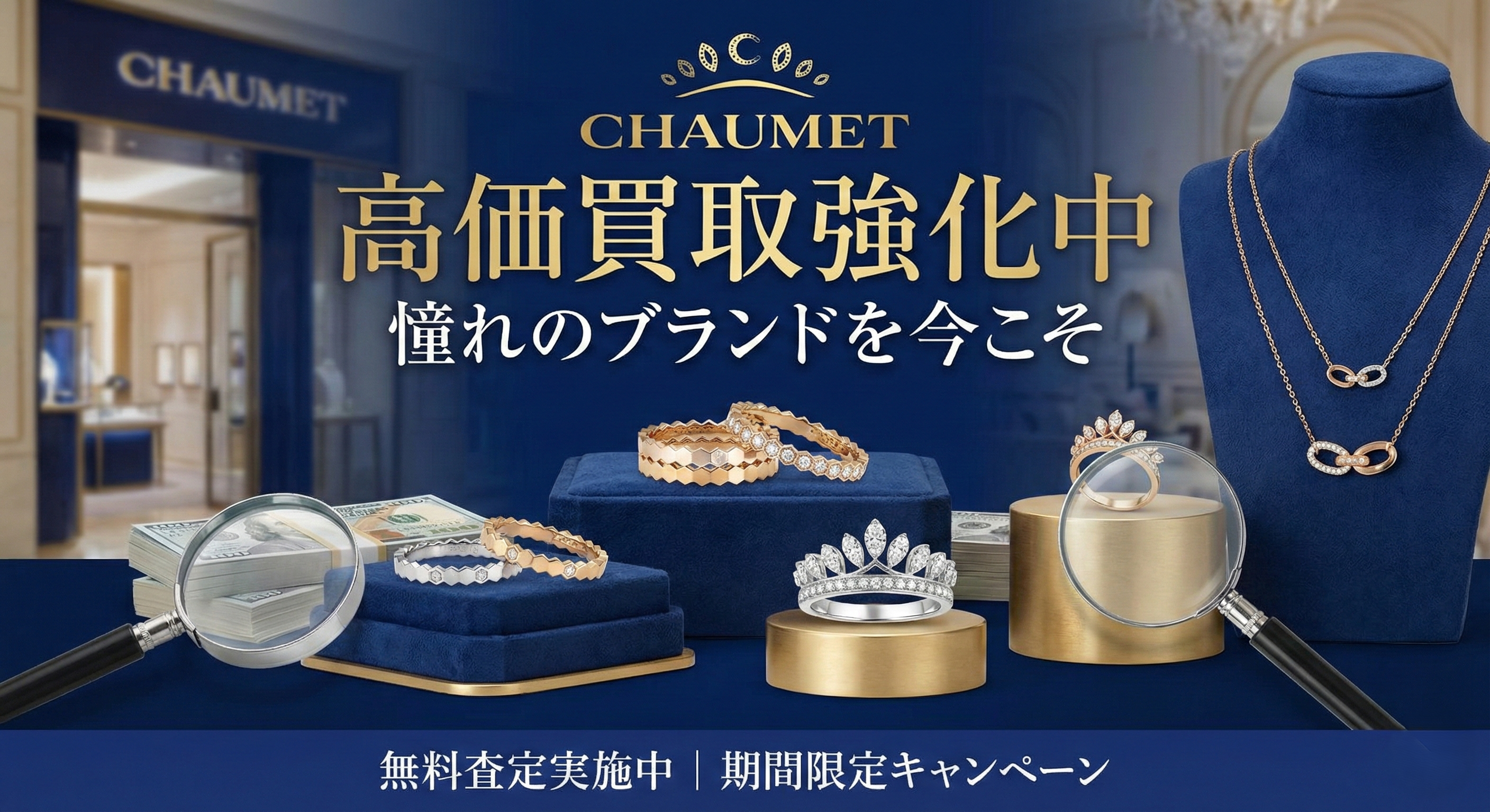 今回は、特に現在需要が高まっている「ショーメ(CHAUMET)」などのブランドジュエリーや、金・プラチナの買取についてご紹介します。お買い物のついでに、ぜひお気軽にお立ち寄りください。