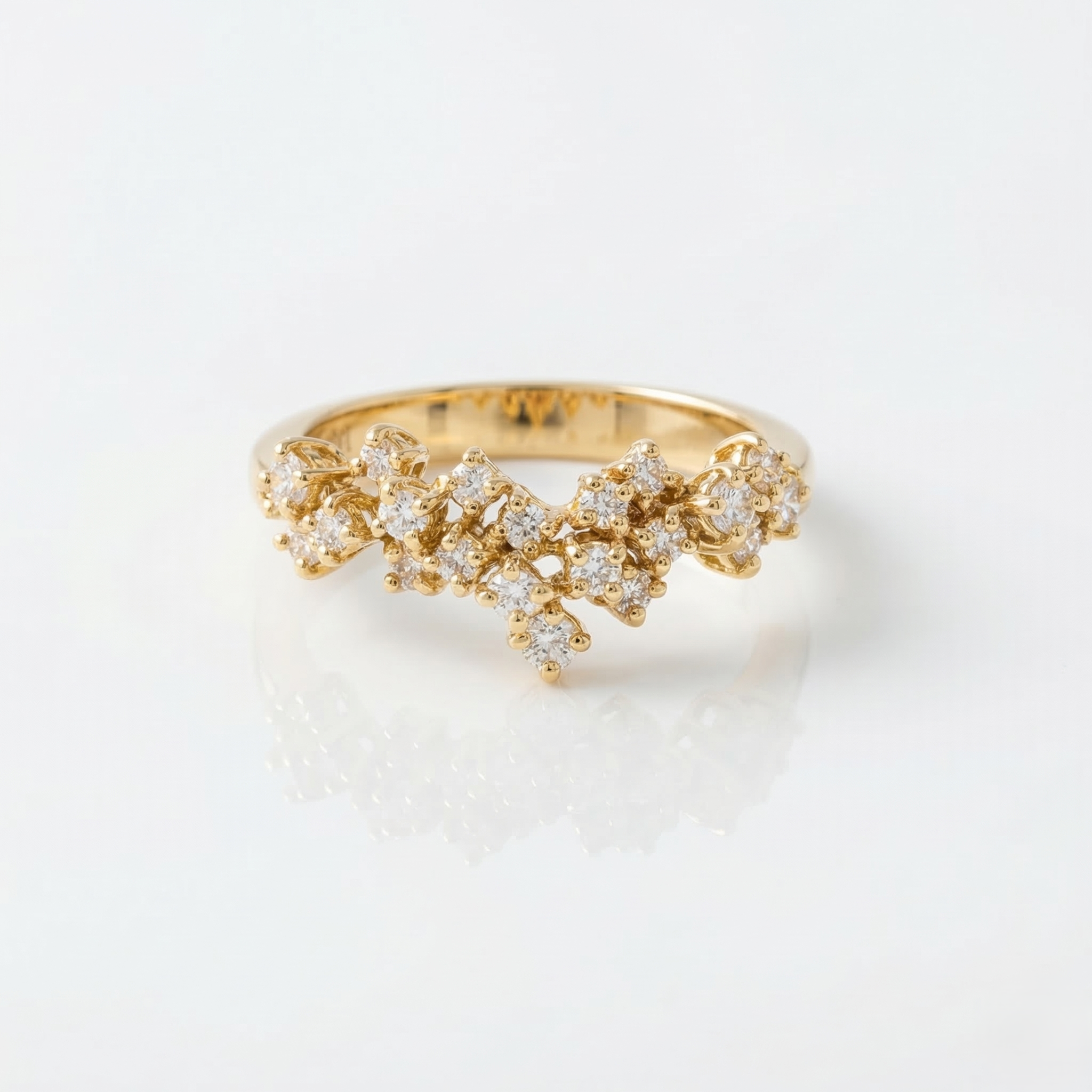 クラスターセッティング 大小様々なダイヤモンドを密集させて留め、一つの大きな輝きのように見せる技法。非常に華やかでボリューム感が出ます。