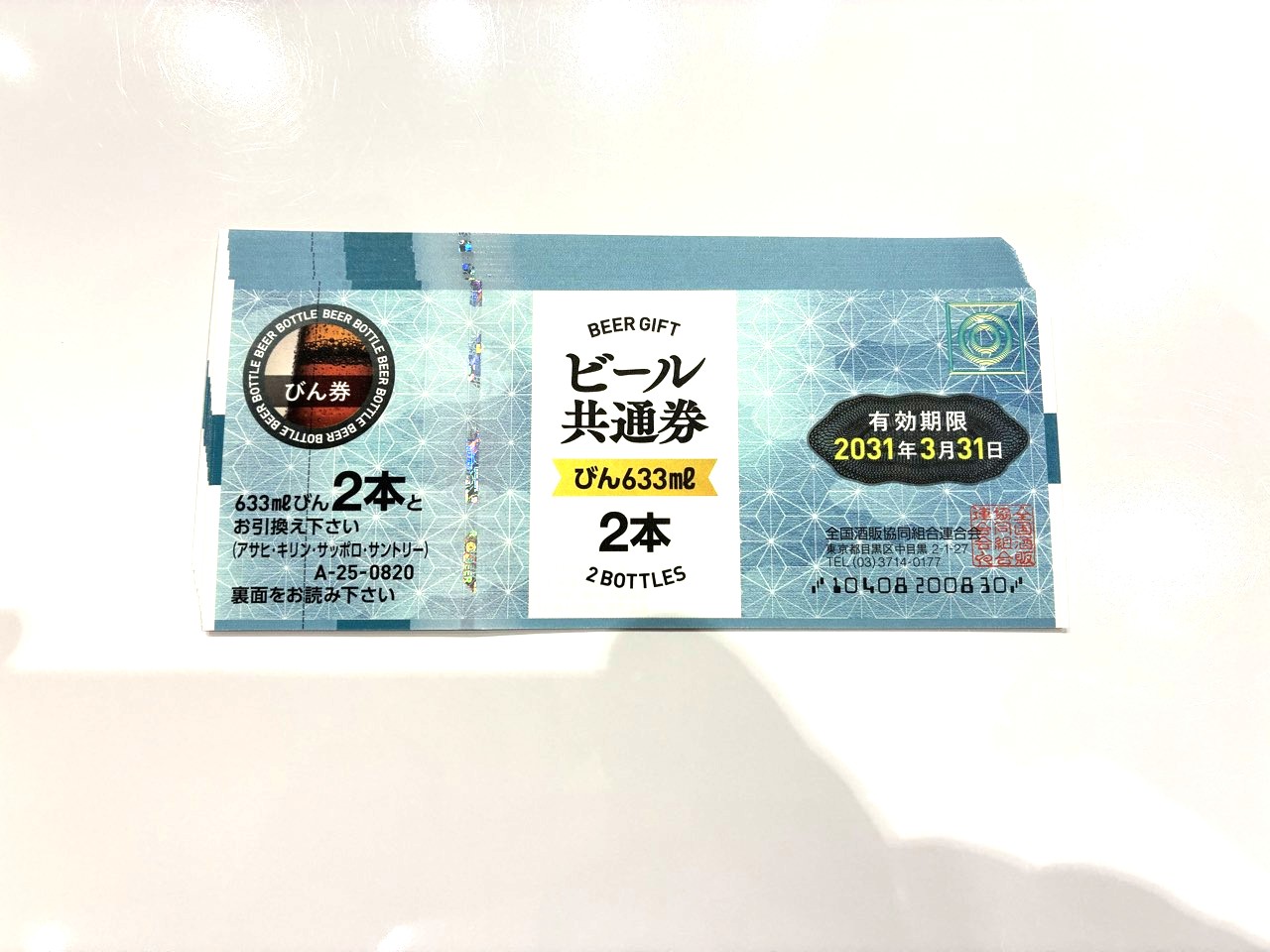 画像の券は 633mL瓶ビールが2本と交換できるタイプで、アサヒ・キリン・サッポロ・サントリーといった主要メーカーのビールに対応しています。