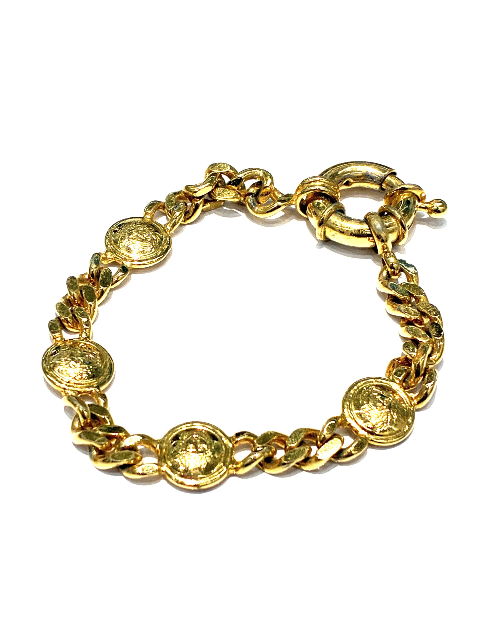 今回その代表的なアクセサリー!メデューサのメダリオンが複数あしらわれたゴールドトーンのチェーンブレスレットお買取り致しました。