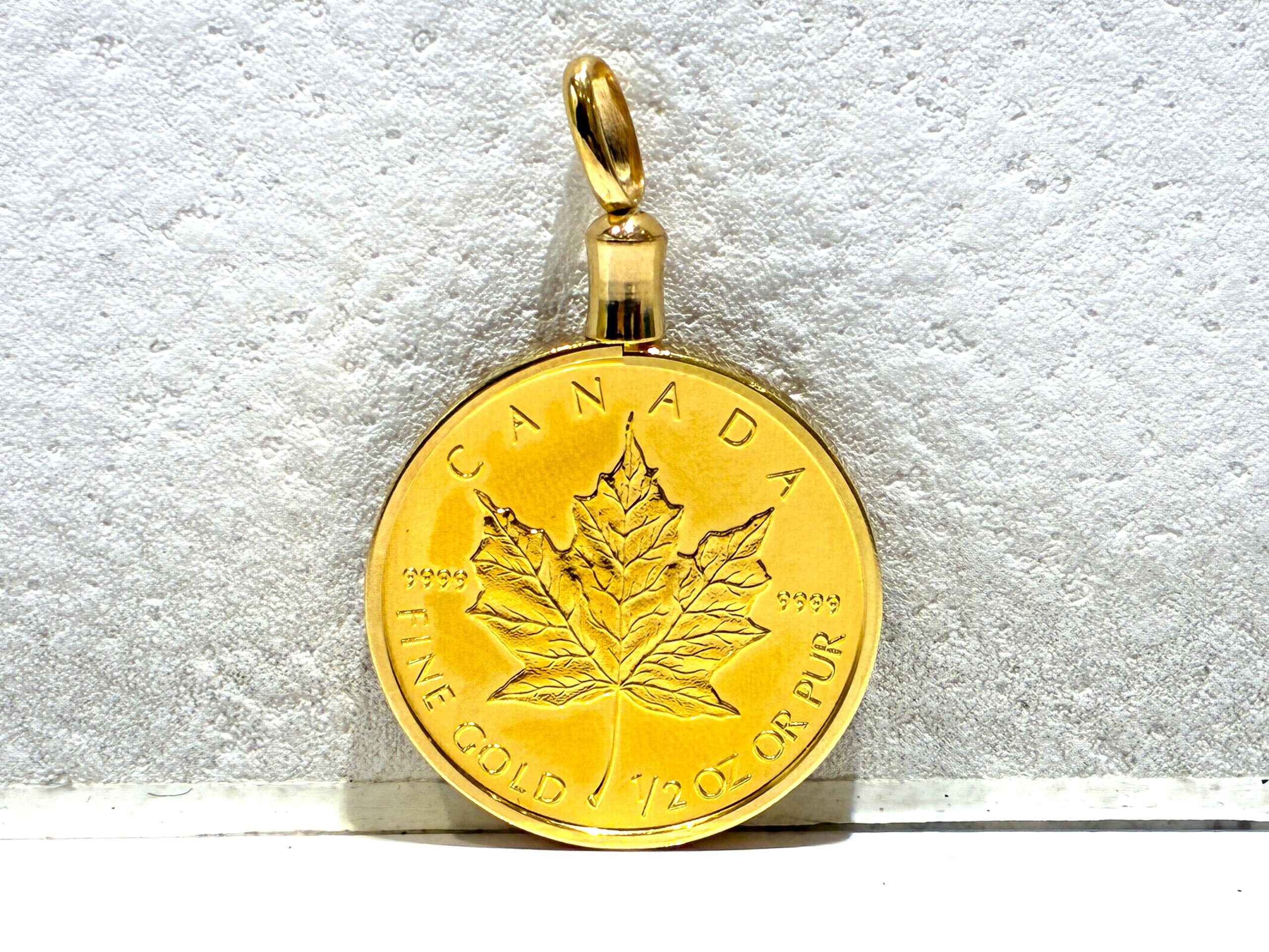 メープルリーフ金貨には、1オンスをはじめ、1/2オンス、1/4オンス、1/10オンスなど複数のサイズがあり、投資用としてはもちろん、今回のようにペンダントトップなどのジュエリー加工品として楽しまれることも多くあります。