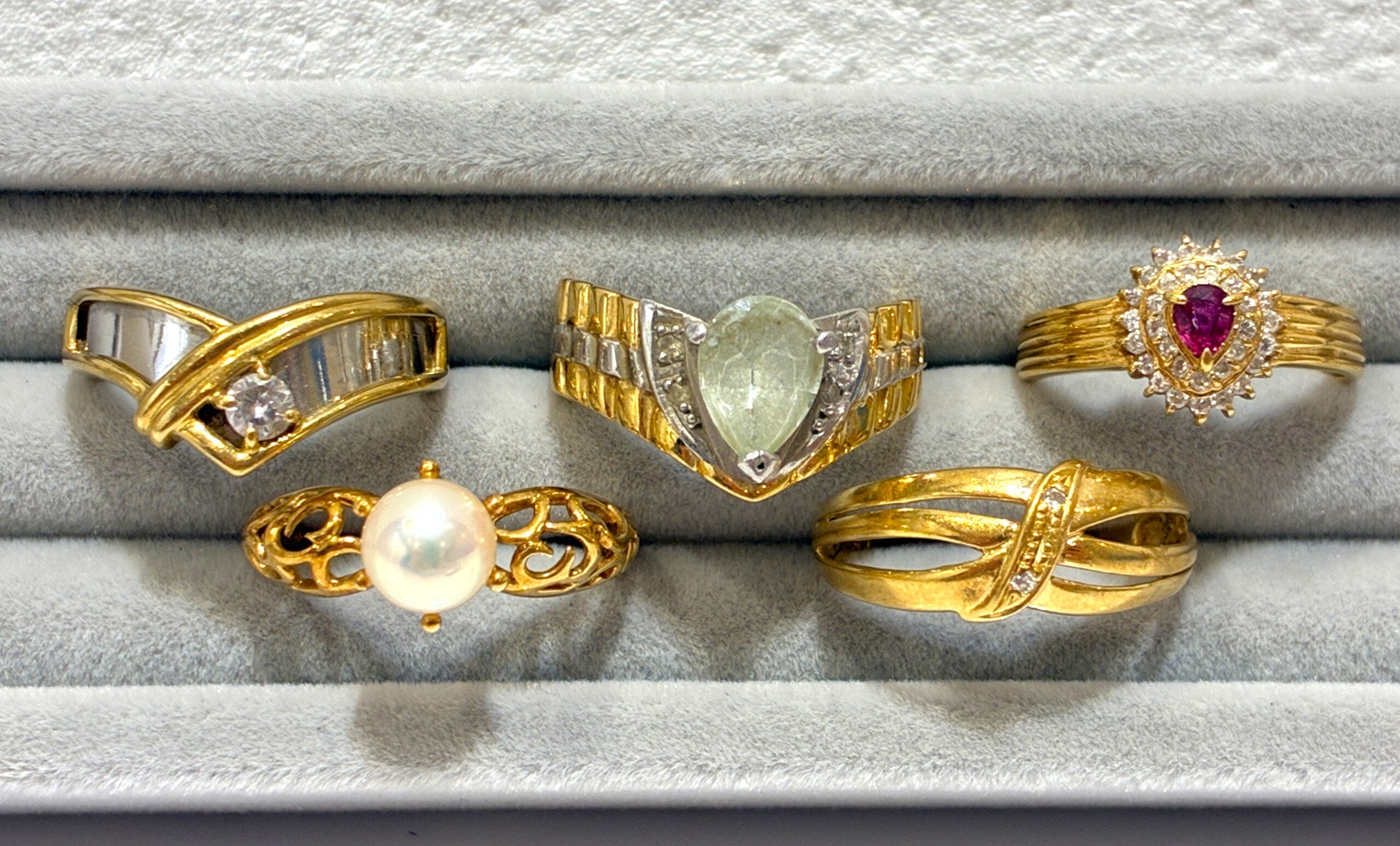 ゴールドの輝きが美しいデザインリングに、透明感のある色石やパール、華やかな装飾が施されたものまで、ひとつひとつに個性と想いを感じるお品ばかりです。