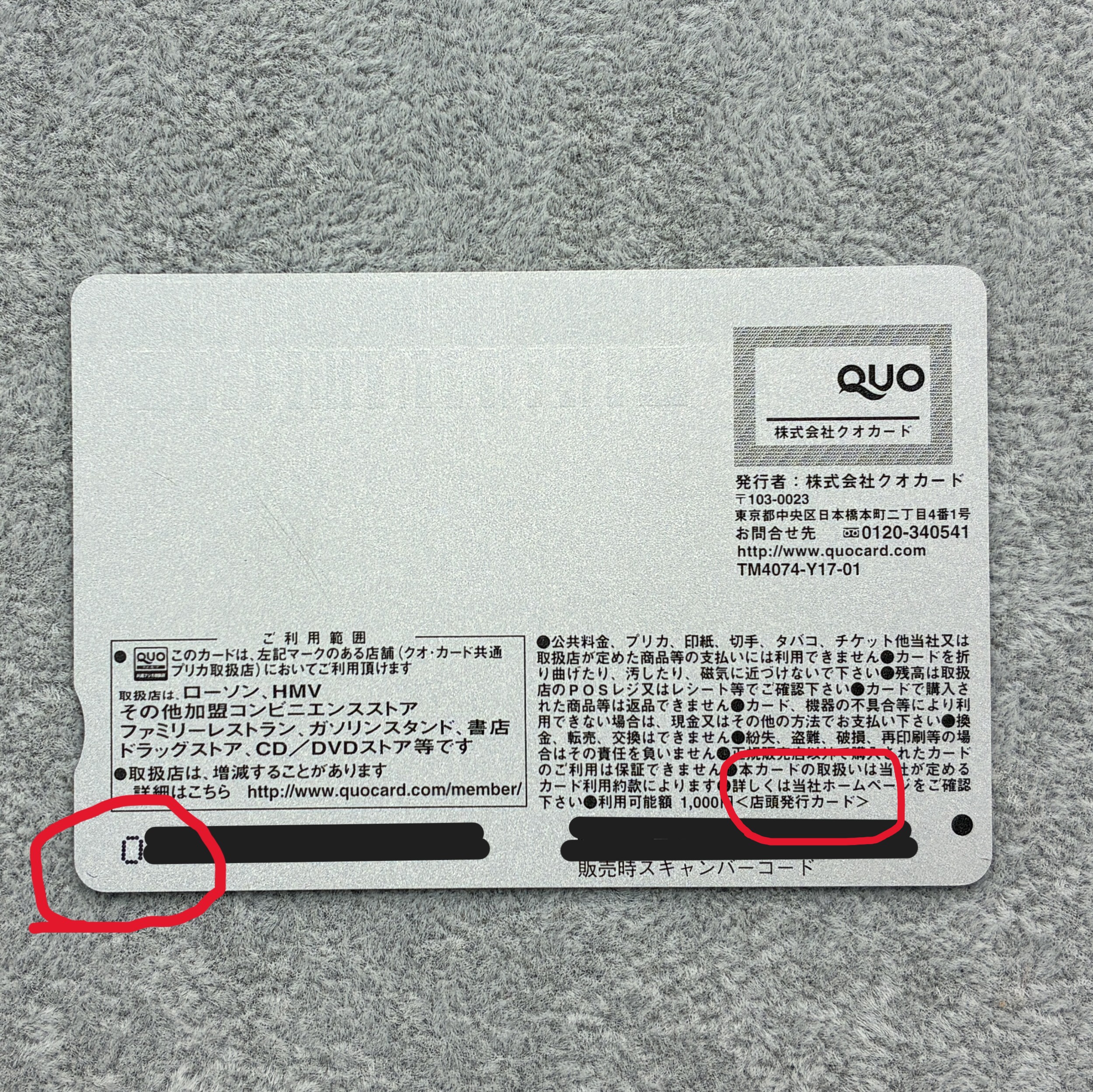 クオカードの裏面を見ると、左下の数字は「0」から始まっていて、右側には「店頭発行カード」と記載されています🔍