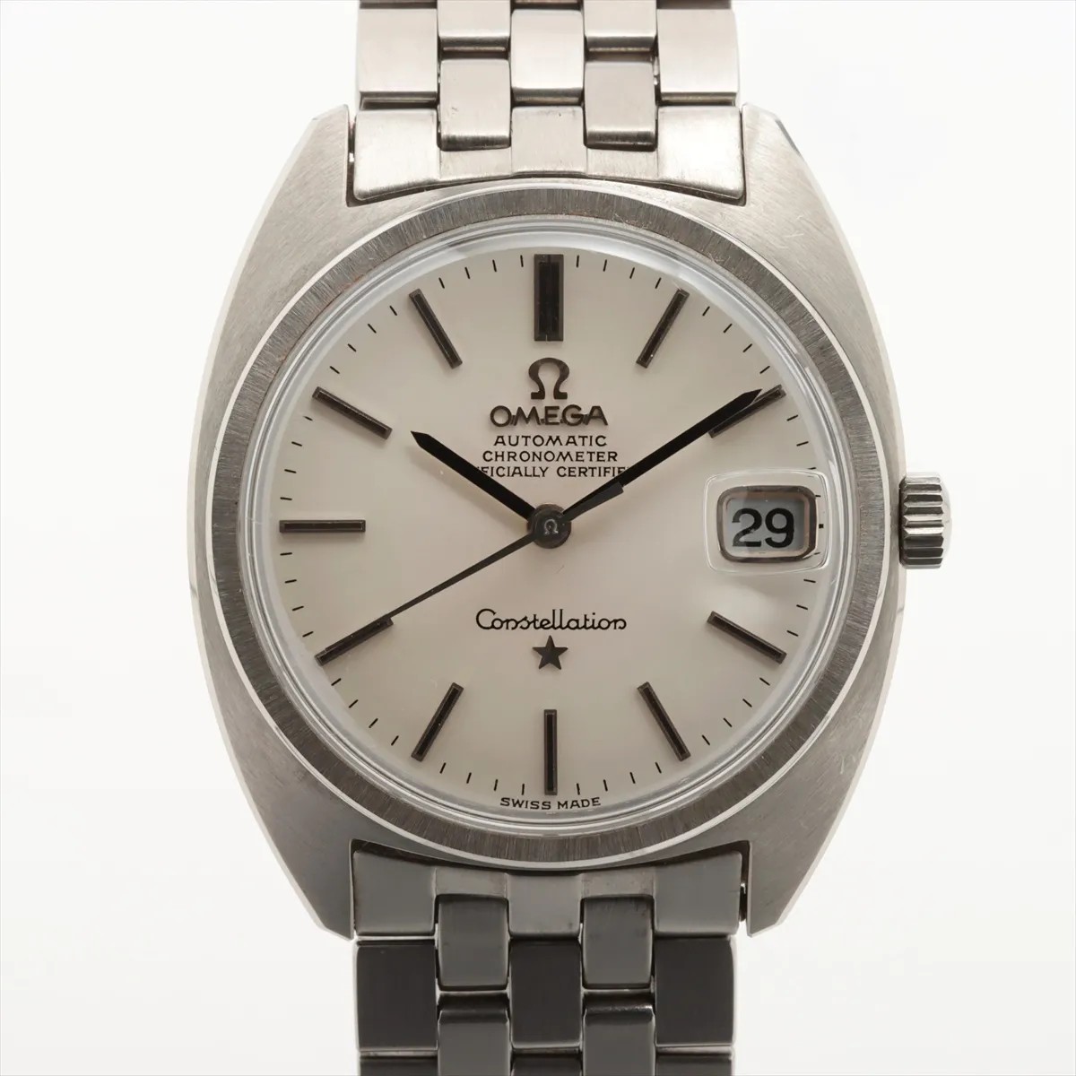 **Constellation Pie-Pan・C-Line(Cケース)**は、1950年代から1960年代にかけて製造されたオメガの代表的なドレスウォッチです。パイパン(円錐型)文字盤の立体的な仕上げと、C字型の特徴的なケースデザインが、当時のスイス時計製造技術の高さを物語っています。特に天文台マークが施されたモデルは、精度への追求を示すプレミアムモデルとして扱われています。