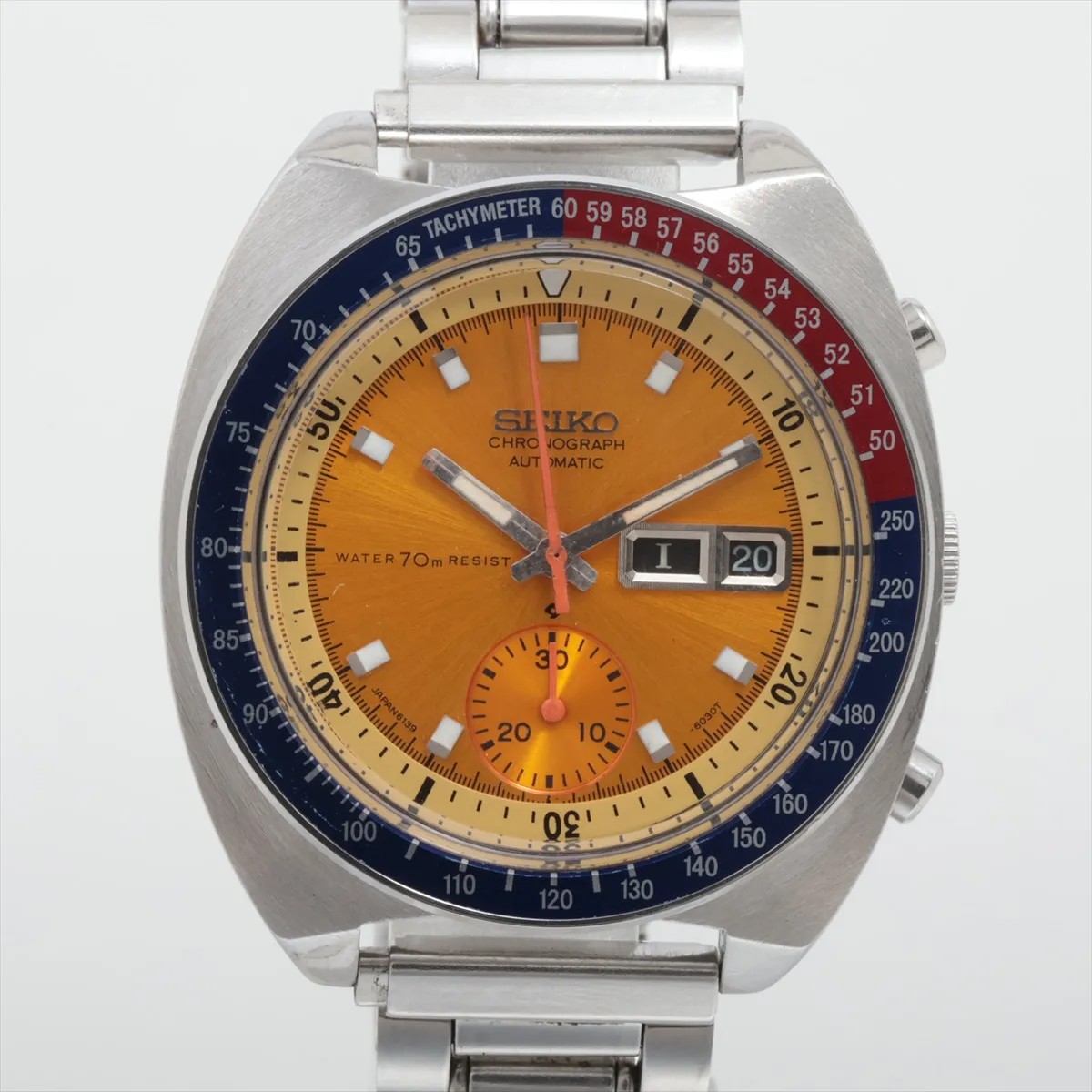 Seiko 6139(通称”Pogue”)宇宙飛行士モデルは、NASA宇宙飛行士ウィリアム・ポーグが実際に着用したことで一躍有名になったクロノグラフです。自動巻きクロノグラフとしては世界初の量産モデルであり、その技術的革新性と宇宙開発との関わりが高く評価されています。イエローやオレンジの鮮やかな文字盤バリエーションは、1970年代のポップカルチャーを象徴する存在として人気を集めています。