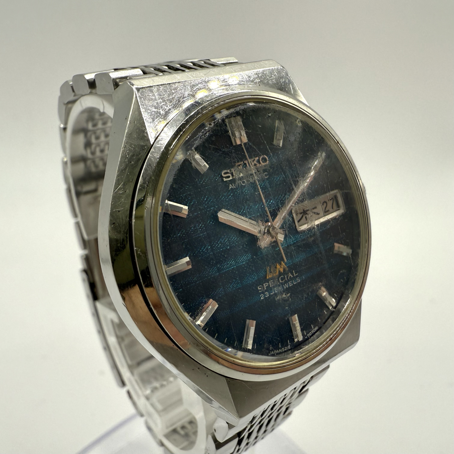 **Lord Matic Special 5216-7070(23石・カットガラス)**は、セイコーの技術力を示す代表的なモデルです。23石という高級機械式ムーブメントと、当時としては革新的だったカットガラスの組み合わせが、現在でも多くの愛好家を魅了しています。特に文字盤のサンバーストパターンと立体的な時間インデックスは、現行モデルでは味わえない独特の存在感があります。
