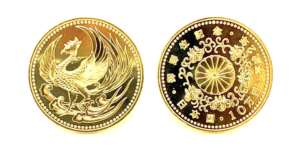 こちらは、平成2年(1990年)に発行された記念金貨で、表面には美しい鳳凰(ほうおう)、