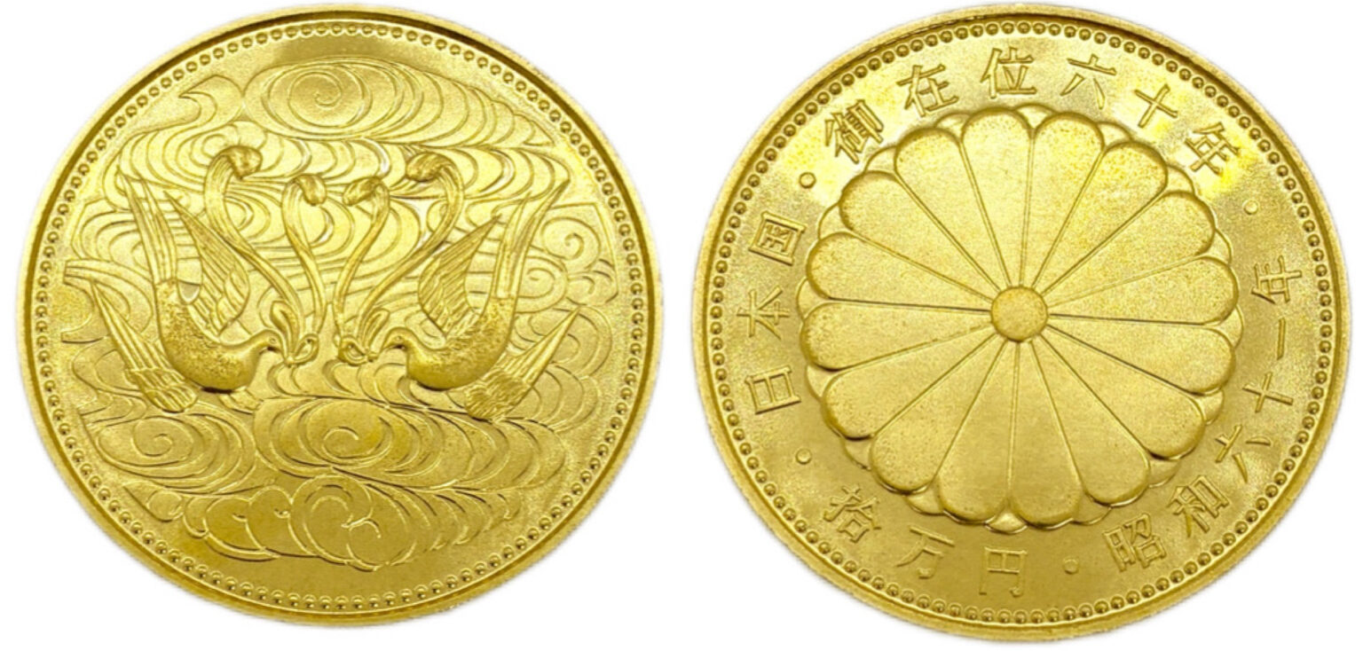 1986年(昭和61年)に昭和天皇の御在位60周年を記念して、日本造幣局より発行された日本初の記念硬貨です。素材には純度99.99%の純金(24金)が使用されています。