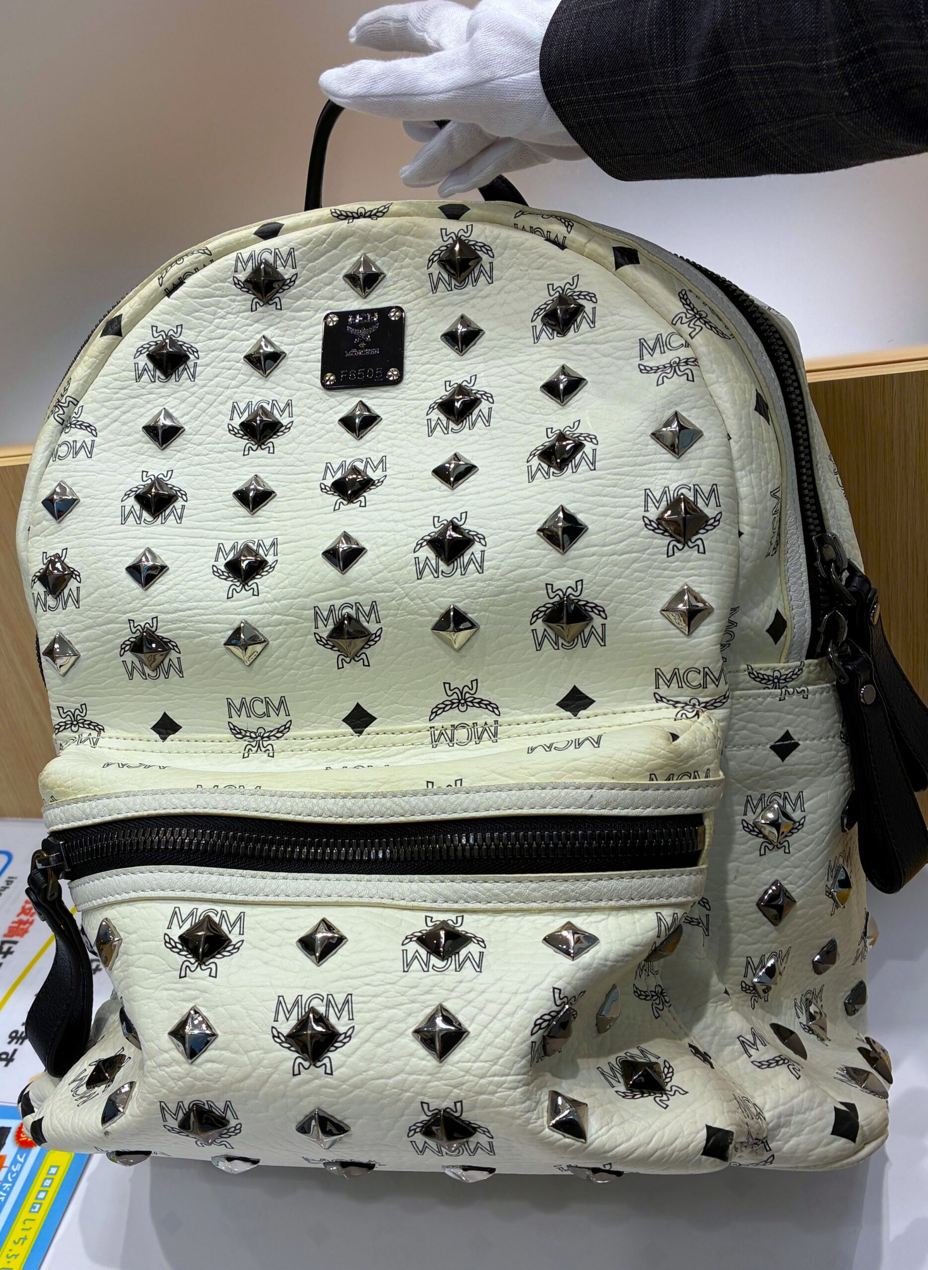 クローゼットを開けたとき、ふと目に入る白色のMCMリュック(ヴィセトス柄・スタッズ付き)