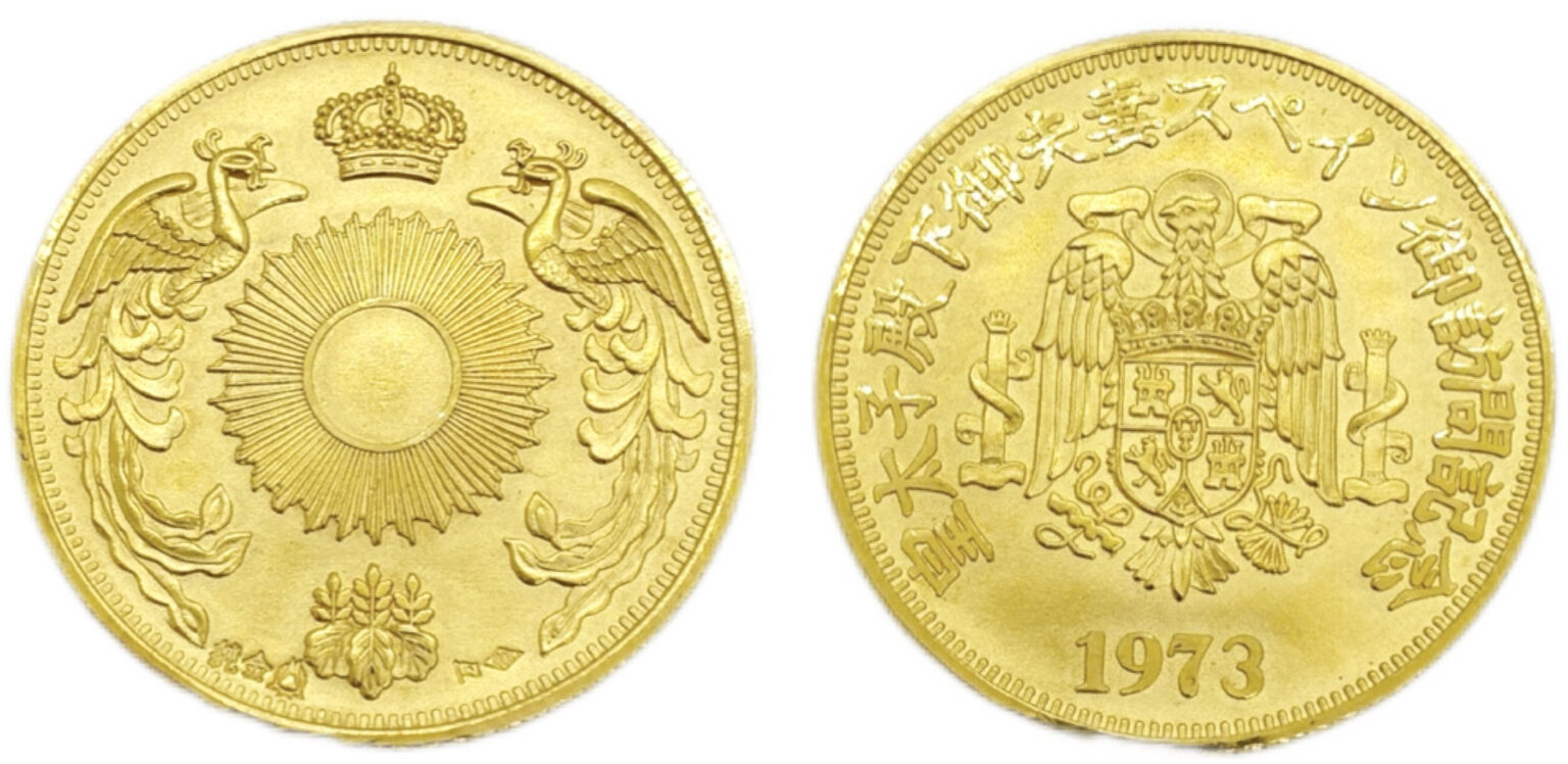 1973年(昭和48年)、皇太子殿下御夫妻(現在の天皇皇后両陛下)のスペイン公式御訪問も記念して発行された記念メダルで、素材には純度99.9%以上である『純金』が使われています。