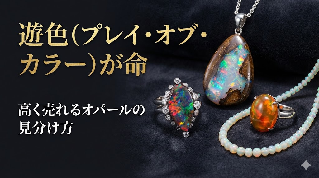 オパールの査定額は「遊色(色の種類・明るさ・面積)」でほぼ決まります。赤が出るか・全面に色が広がるか・鮮明かどうかが最重要ポイントです。鑑別書があると査定がよりスムーズになり、高額品では特に有利に働きます。