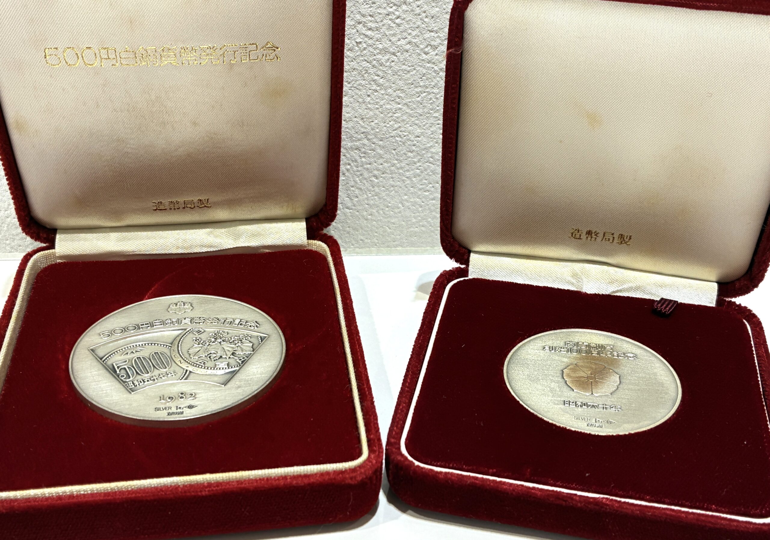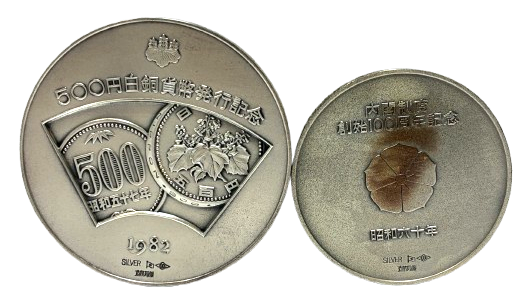 👉左のメダルは、500円白銅貨幣発行記念メダル 昭和57年4月に発行された500円白銅貨発行を記念して製造されました。