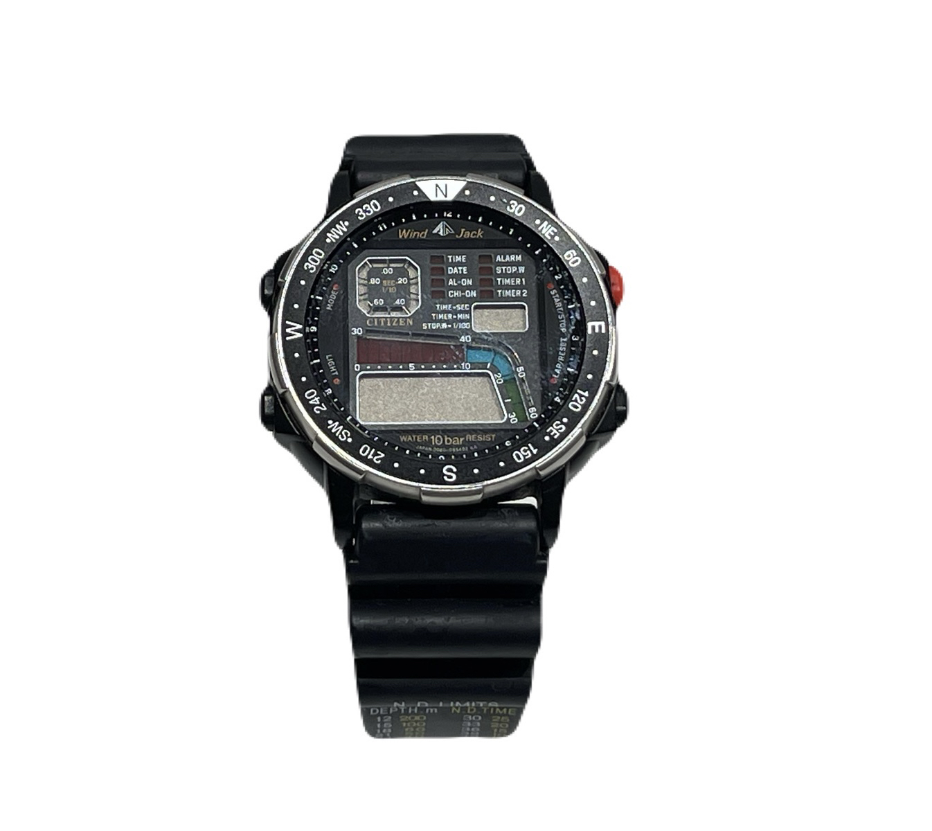 CITIZEN Wind Jack ウインドジャック D060‑086783 は、1980年代にシチズンが発売した ヴィンテージ・スポーツデジタル時計 です。正式には「Wind Jack(ウインドジャック)」というシリーズ名で、当時のスポーツ・アウトドア向けモデルとして人気を博しました(特にヨット競技/ウインドサーフィン用として設計)シチズンウオッチ オフィシャルサイト