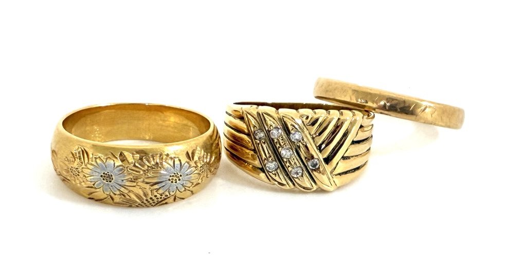 中央のリングは、立体的に交差するラインが特徴的なボリューム感のあるデザインリング💍です。リングの中央部分には小粒のダイヤモンド💎がセッティングされており、ゴールドの輝きとダイヤモンドの透明感が美しく調和しています。このようなクロスデザインや立体的なデザインは、1980年代から2000年代頃に多く見られたスタイルで、存在感のあるジュエリーとして人気がありました👆