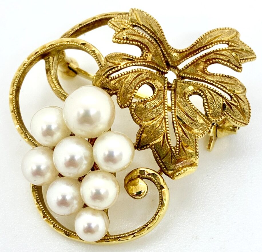 葉の部分と葡萄の房が繊細に表現された上品なデザインに仕上がっており、ミキモトならではの高品質なパールとゴールドの輝きが特徴的な逸品です。