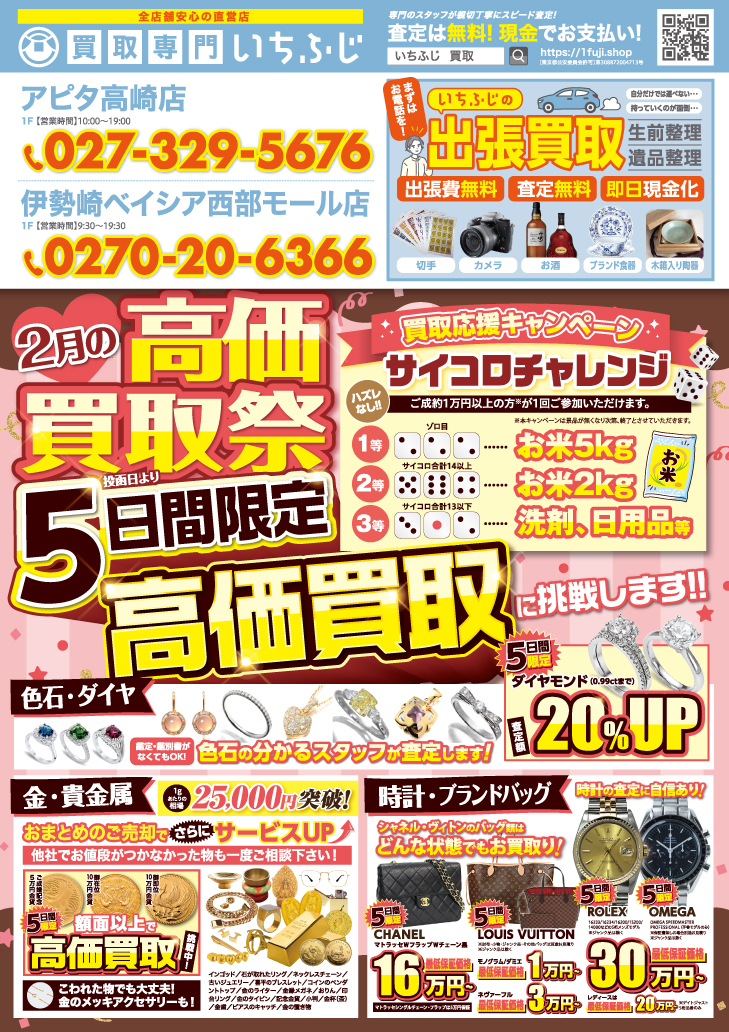 その他にも、いちふじでは金貨、時計、CHANEL、LOUIS VUITTONのバッグなど(※一部モデル、ジャンク品を除く)多数の高価買取保証を大好評実施中ですのでお持ちの方は是非お近くのいちふじまでご来店くださいませ☆