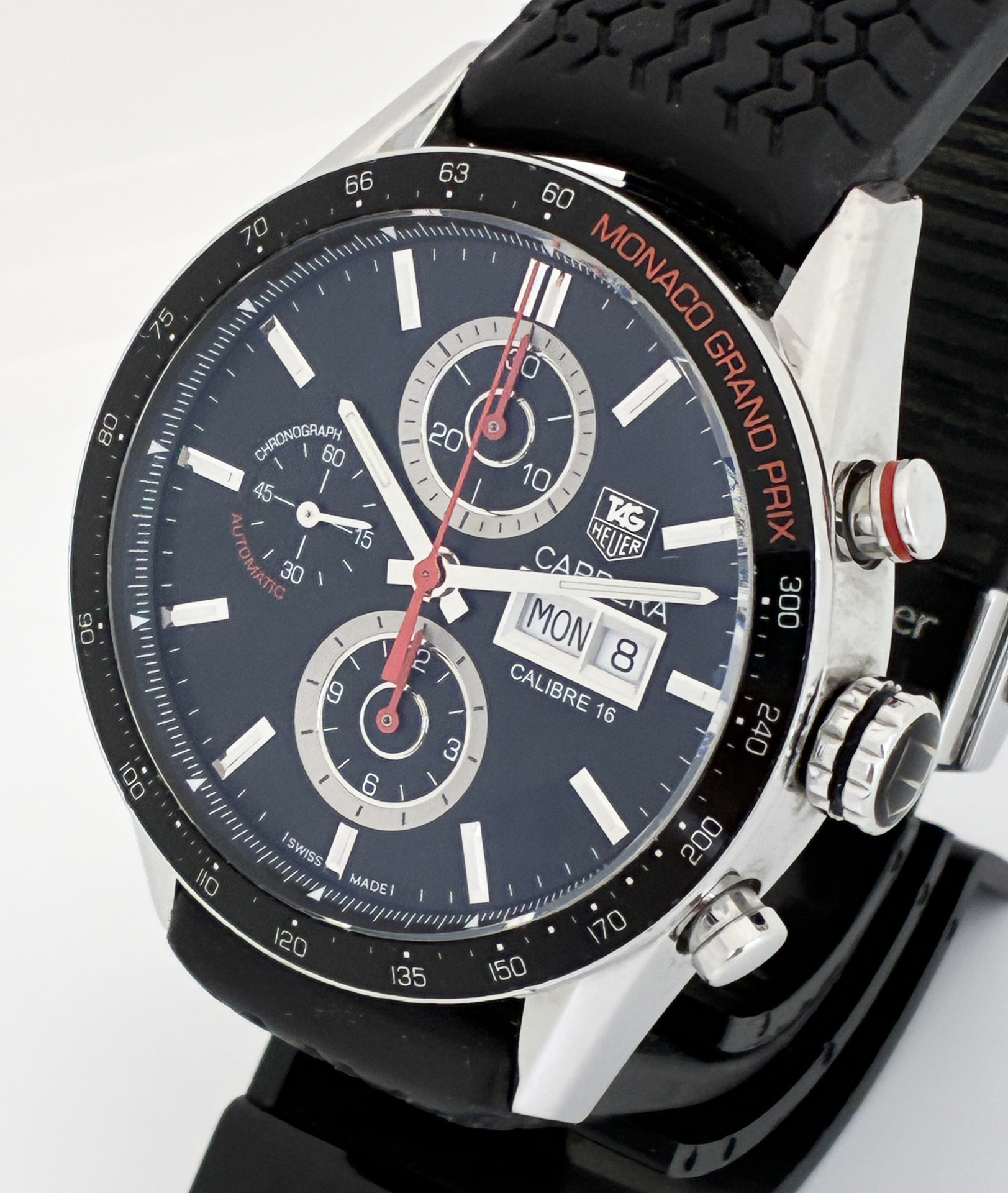 そんなタグ・ホイヤーから、今回ご紹介の「カレ ラタキメーター クロノグラフ デイデイト モナコグランプリ」は、【ル・マン24時間耐久レース】【インディ500】に並ぶ世界3大レースの一つ【モナコグランプリ】に敬意を表し発売されました。